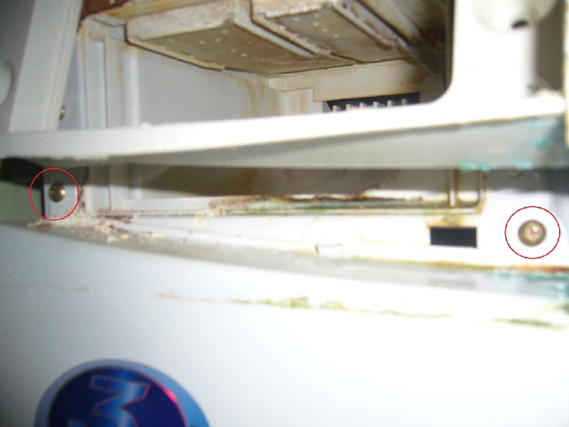 После проделанной работы переходите вниз. Снимите нижнюю фальшпанель и под ней вы обнаружите 4 самореза, которые надо тоже удалить. Заодно открутите винты, которые обведены зелеными кружками.